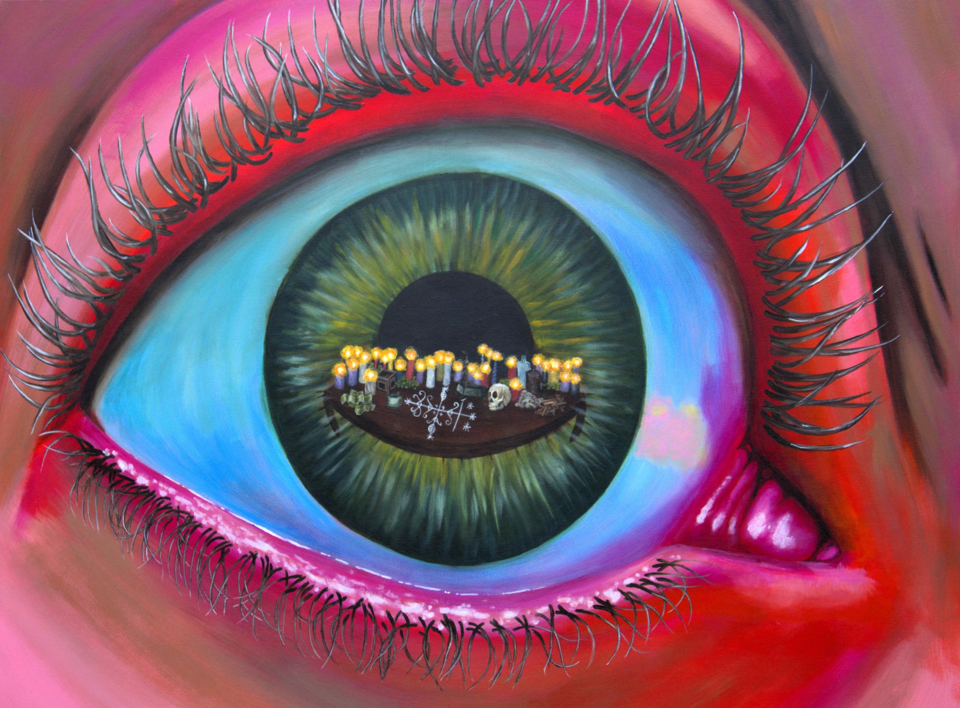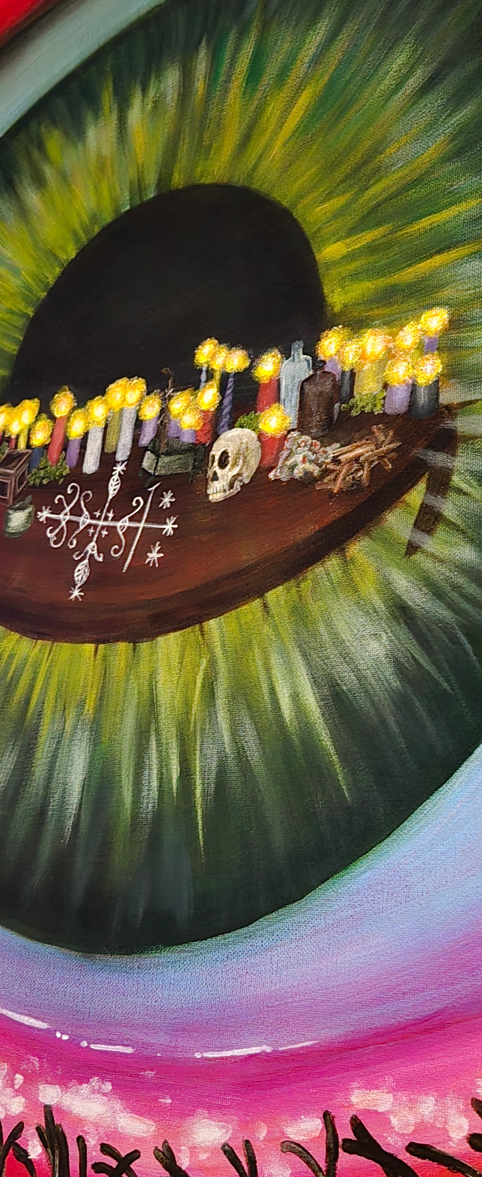 Within the eye is the faint reflection of a ritual space inspired by Hoodoo and Voodoo traditions - a world of unseen debts, obligations, and unseen forces. The energy of the moment is thick and tangible: the tension between desire, morality, and consequence pulses from the canvas This is a moment suspended in time, where every heartbeat counts, where the next action could plunge deeper into chaos, or shatter everything left standing.