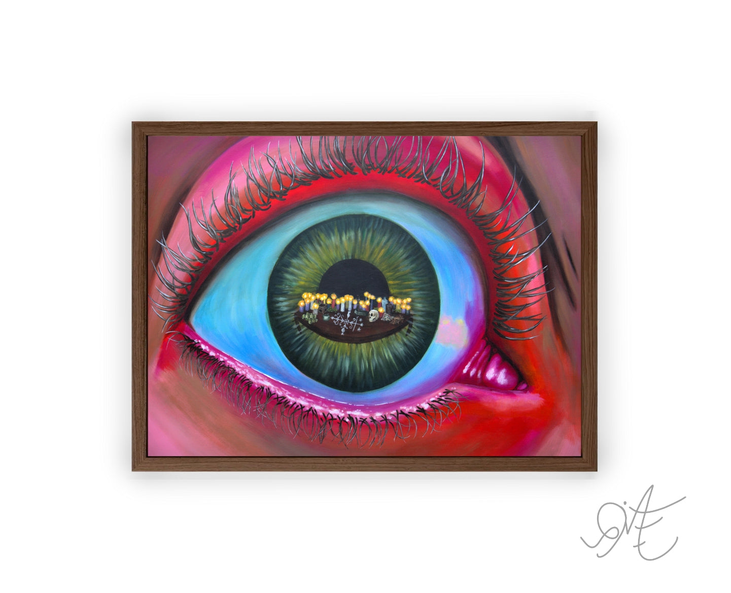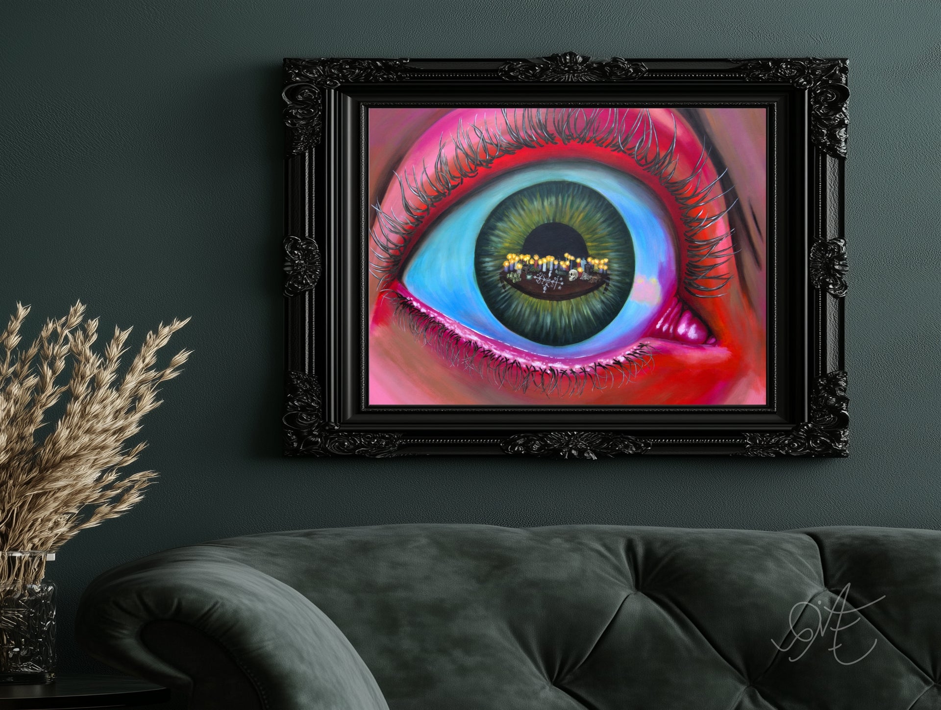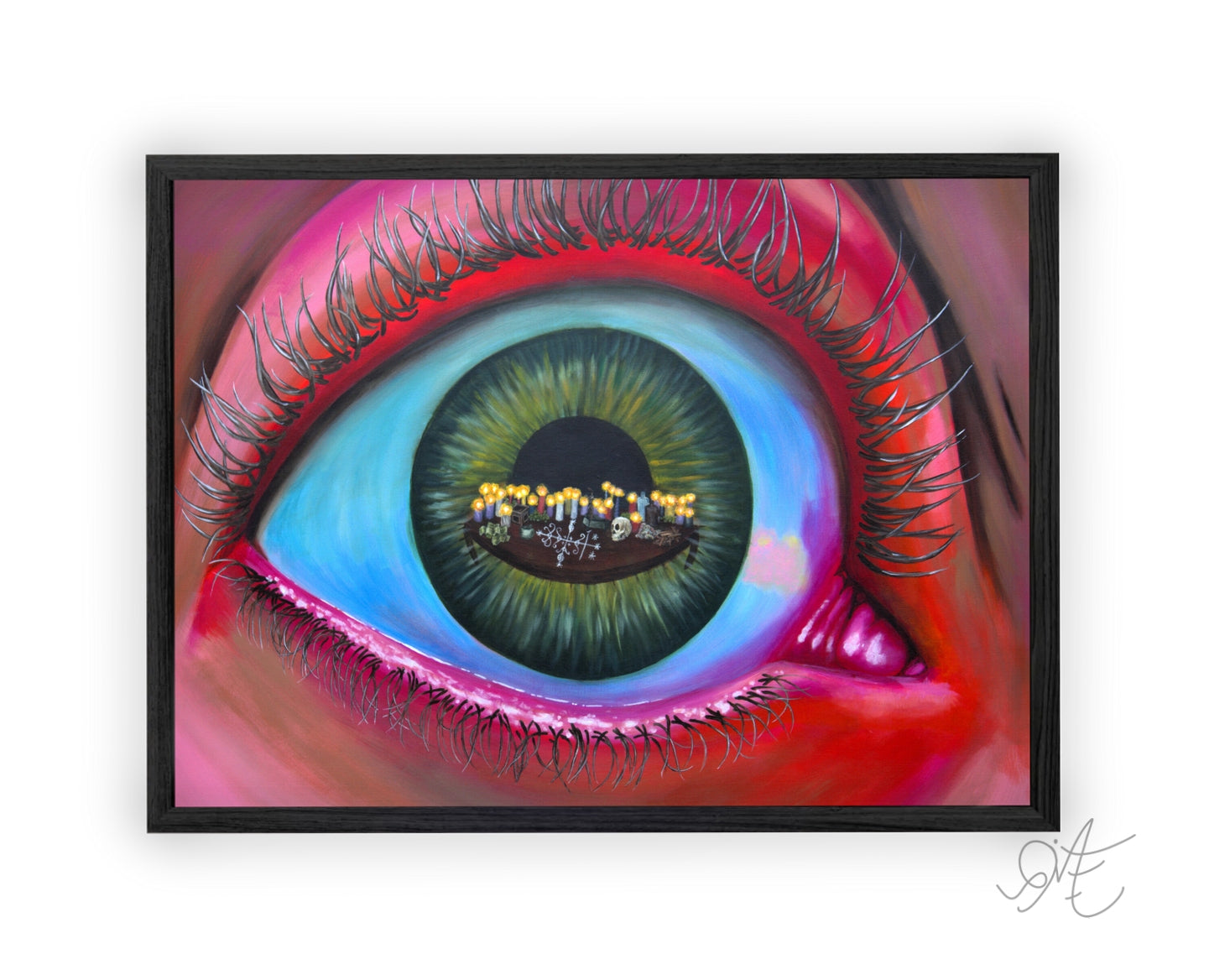 This reproduction throws the viewer into the unbearable tension of desperation. At its center is a single green eye - alive, piercing, and unrelenting - the gaze of someone teetering on the edge of control. This is the eye of a person who has gone too far, who has crossed invisible lines, driven by a need that is urgent, primal, and utterly consuming. We do not know how much further this desperation can go, and that uncertainty makes the moment unbearable.