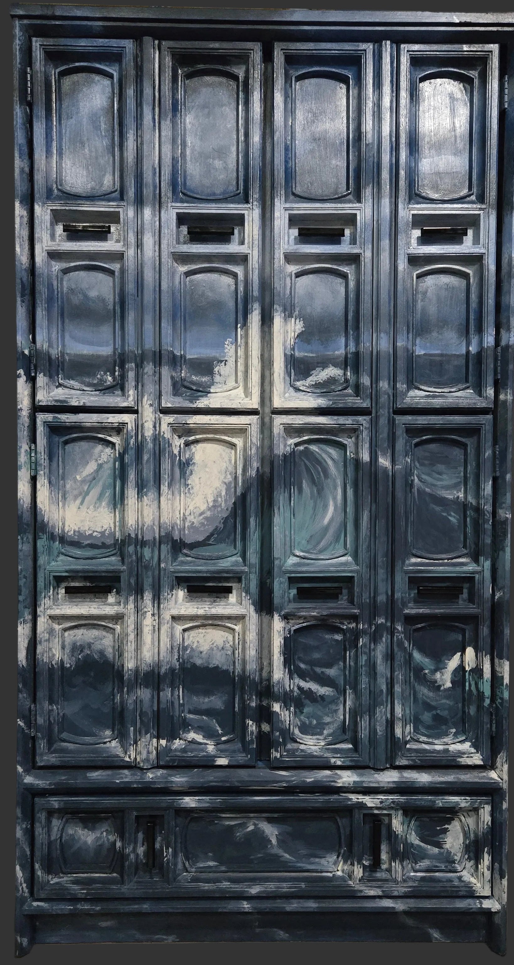 Inspired by the mythic depths of the sea, this vintage armoire takes on a new life as Davy Jones' Locker. It captures the horror, mystery, and awe of a storm-tossed ocean and the dark unknown lurking beneath its waves. This piece doesn’t just decorate a room—it transports the viewer into a world where nature’s fury and the unseen depths collide.