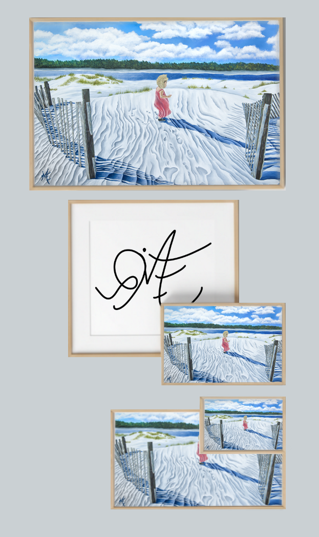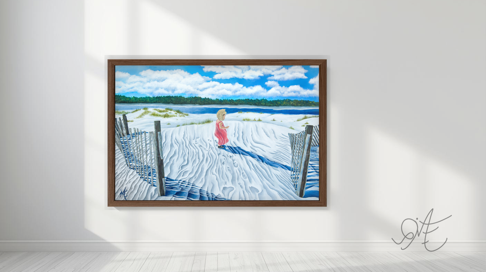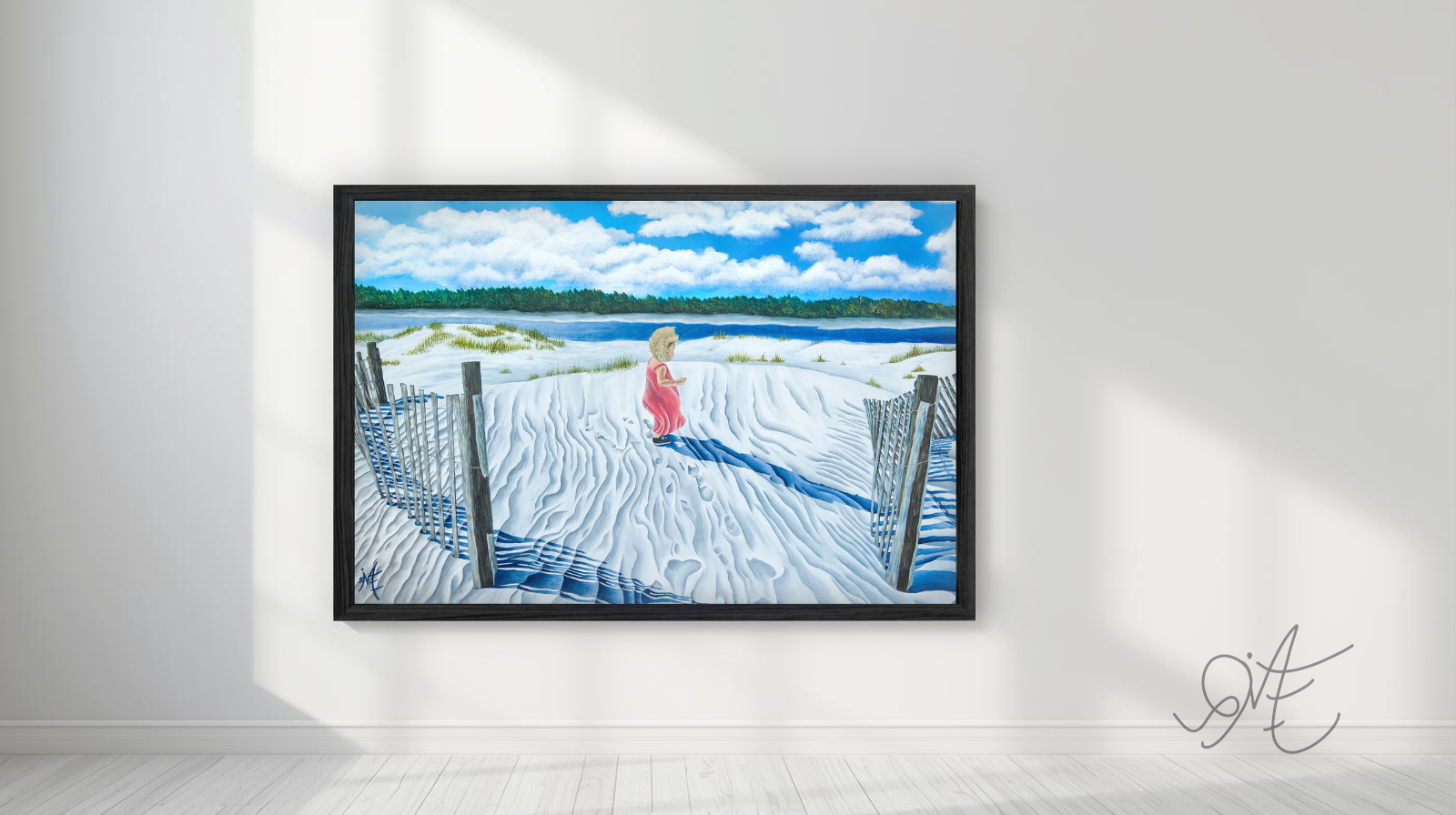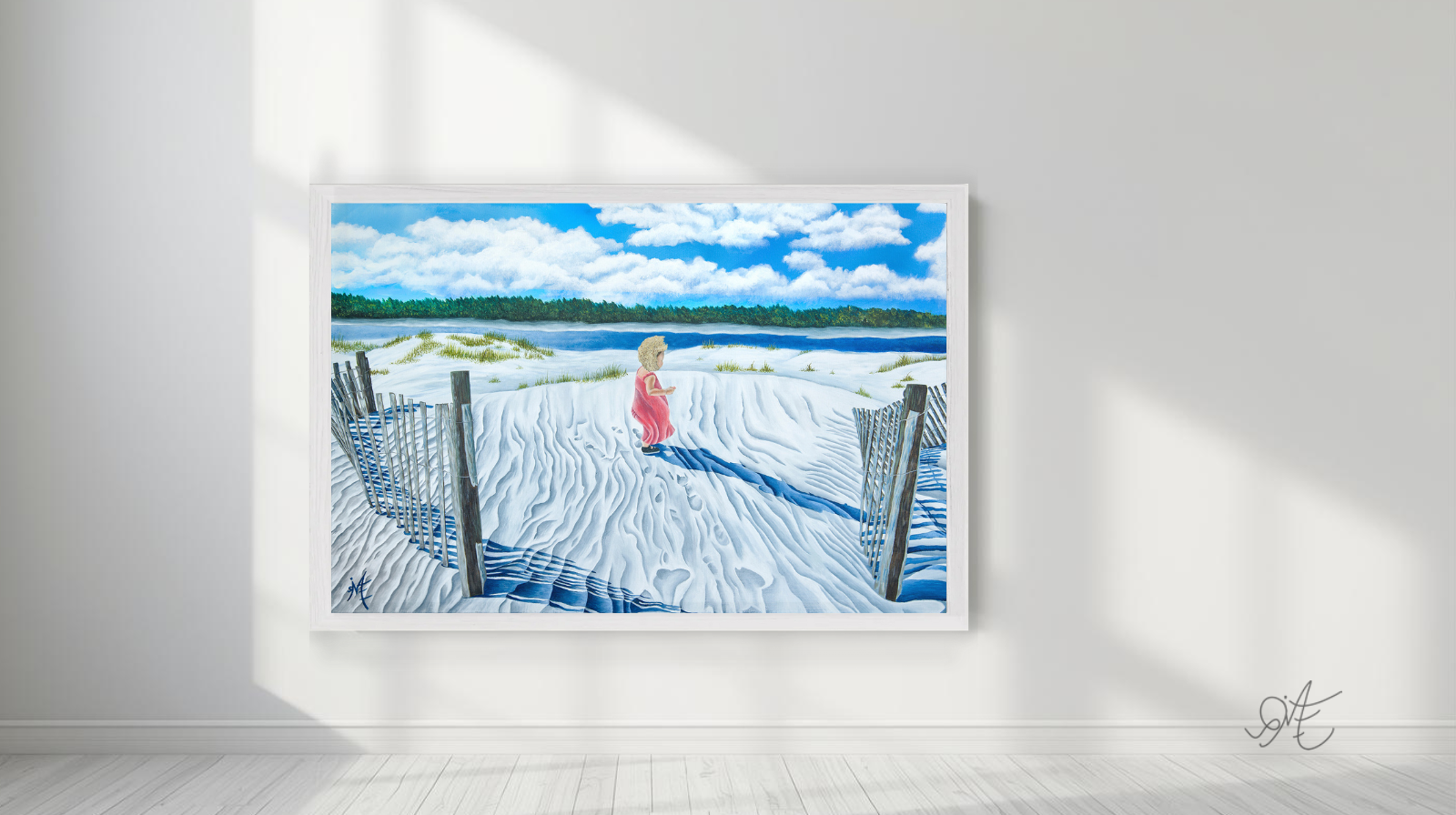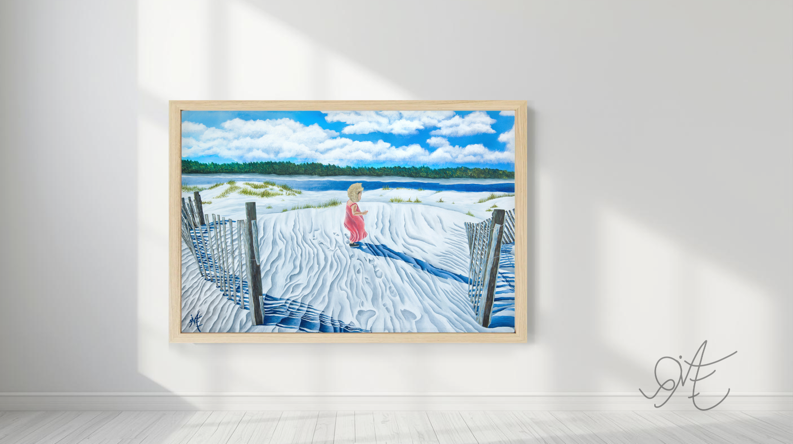 is about innocence, risk, memory, and the unbearable tenderness of knowing a moment is ending even as you’re still inside it. It is the kind of moment that builds us — not through spectacle, but through stillness. Through surreal shading techniques and bold vibrant colors the toddler is depicted innocently and independently enjoying her exploration of a sand dune..
